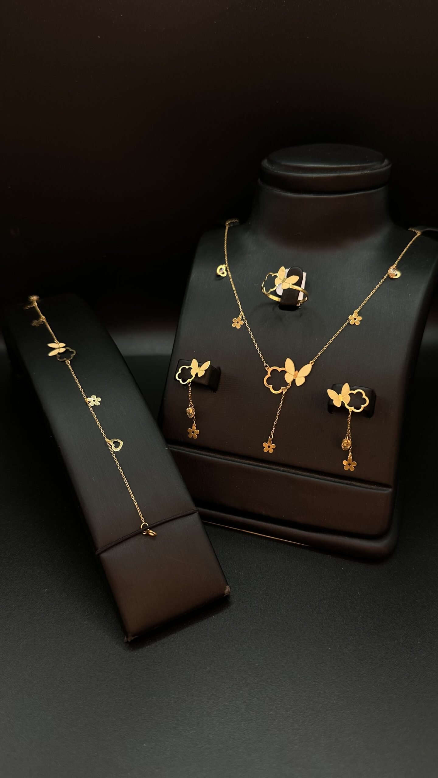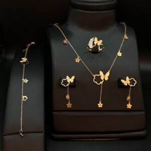 تميز طقم الفراشة بتصميمه الفني المستوحى من شكل الفراشة، مما يعكس حياة نابضة واستقامة لا متناهية. التفاصيل الدقيقة والإبداع الموجود في كل جزء من الطقم تضيف لمسة مميزة تناسب ذوقك الفريد.