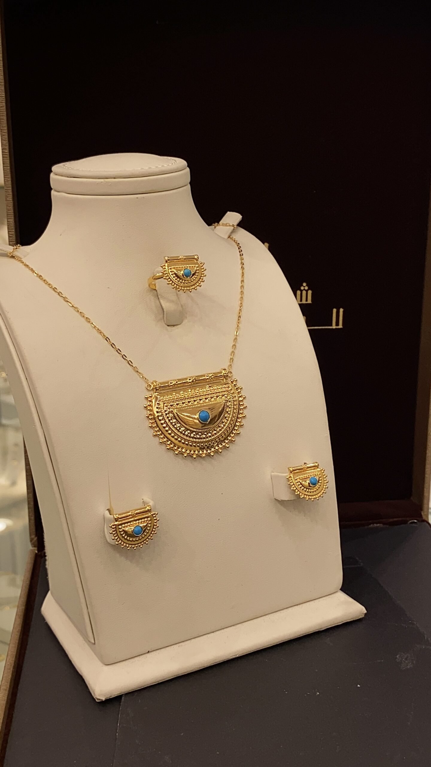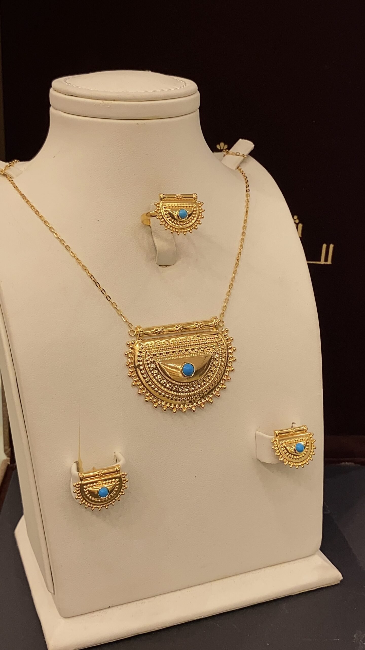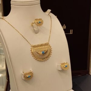 تزينه لمسات من الفيروز الفاخر، مما يضيف لمسة جذابة مميزة تلفت الأنظار. اجعل هذا الطقم الإضافة المثالية لمجموعة مجوهراتك.