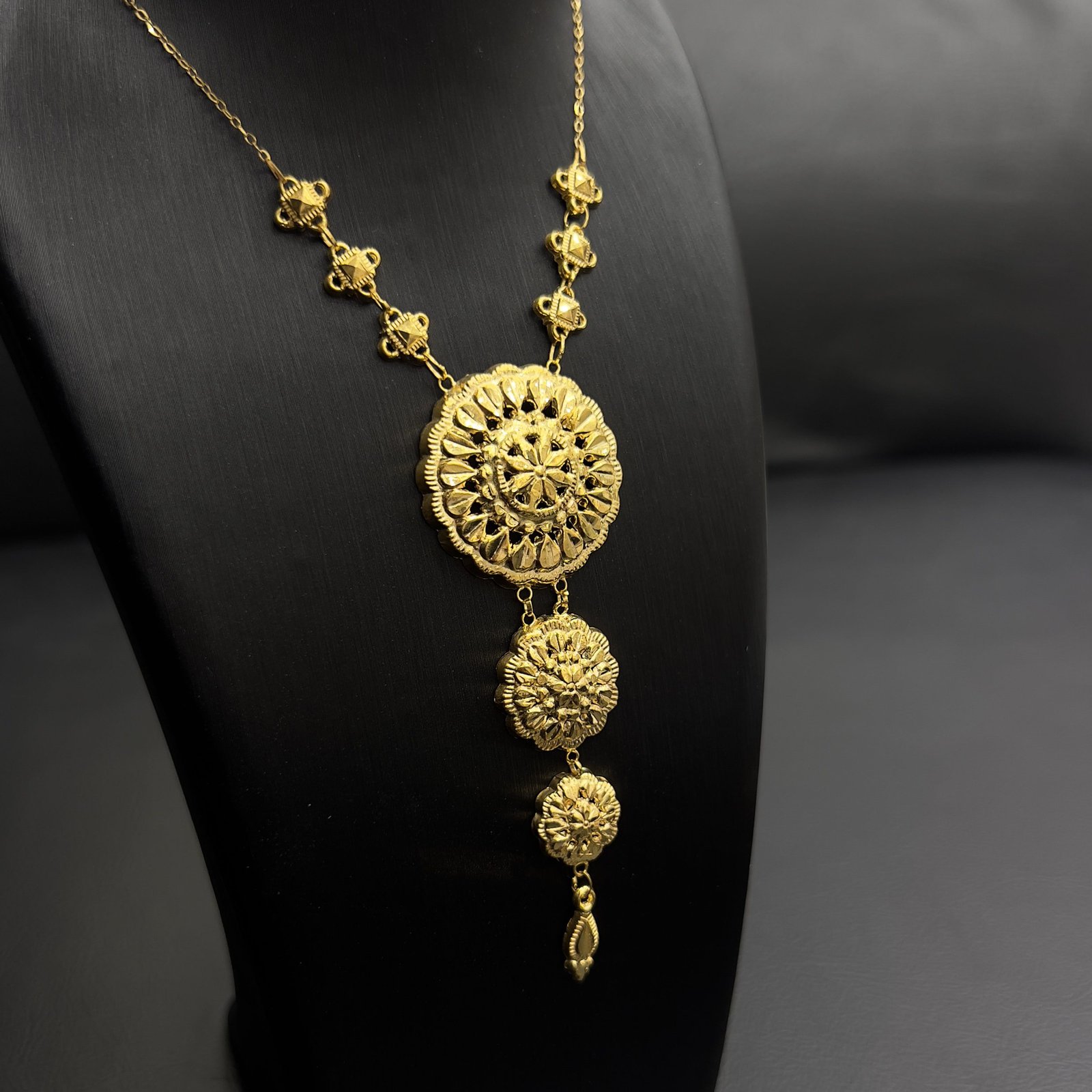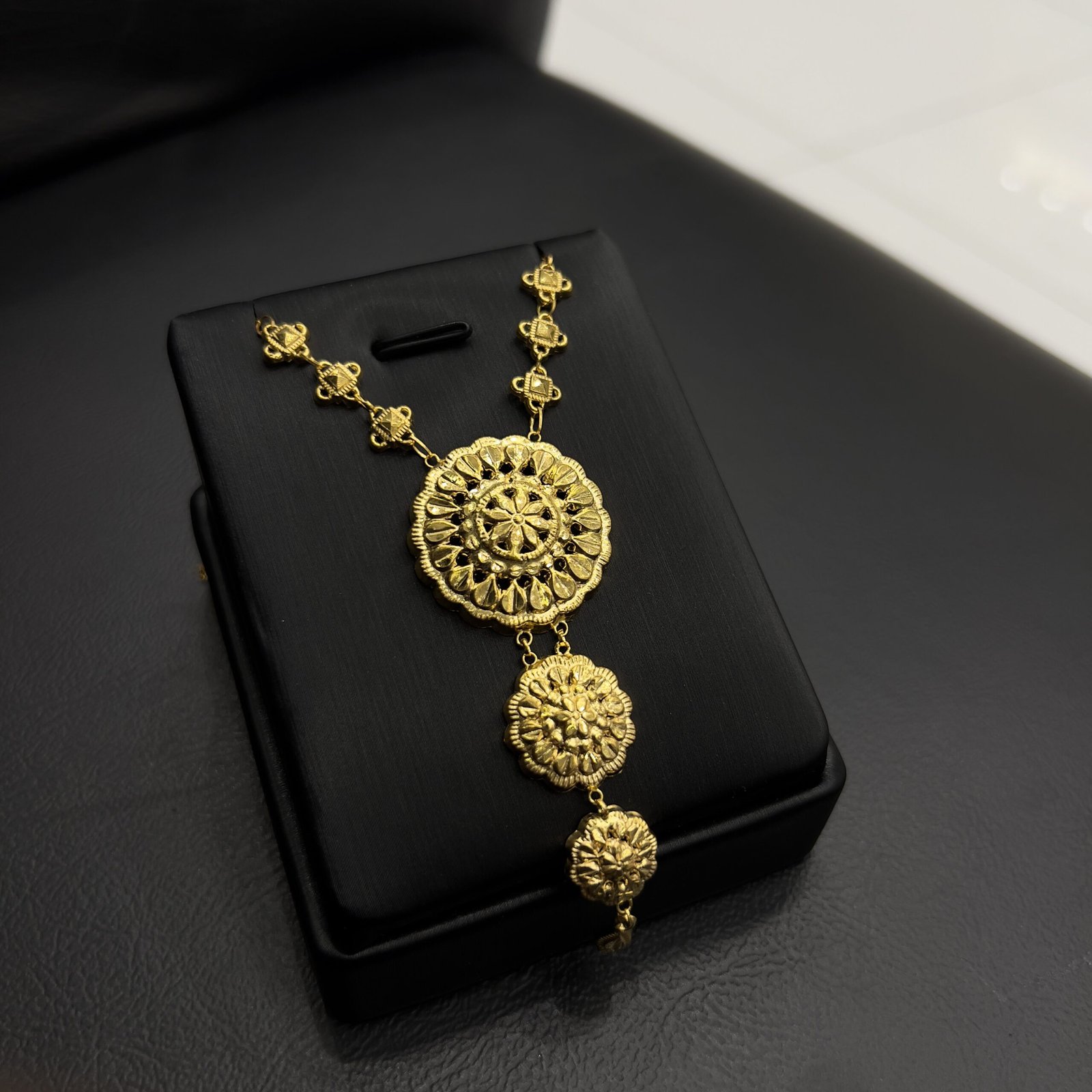 عقد كرسي جابر عيار 21 مصمم بشكل مبتكر ومناسب لجميع النساء اللواتي يرغبن في ارتداء مجوهرات تعكس أناقتهن. يتميز بتصميم فريد يعكس التراث والجمال التقليدي مع لمسة عصرية، مما يجعله عنصر جذب دائم.