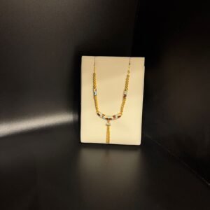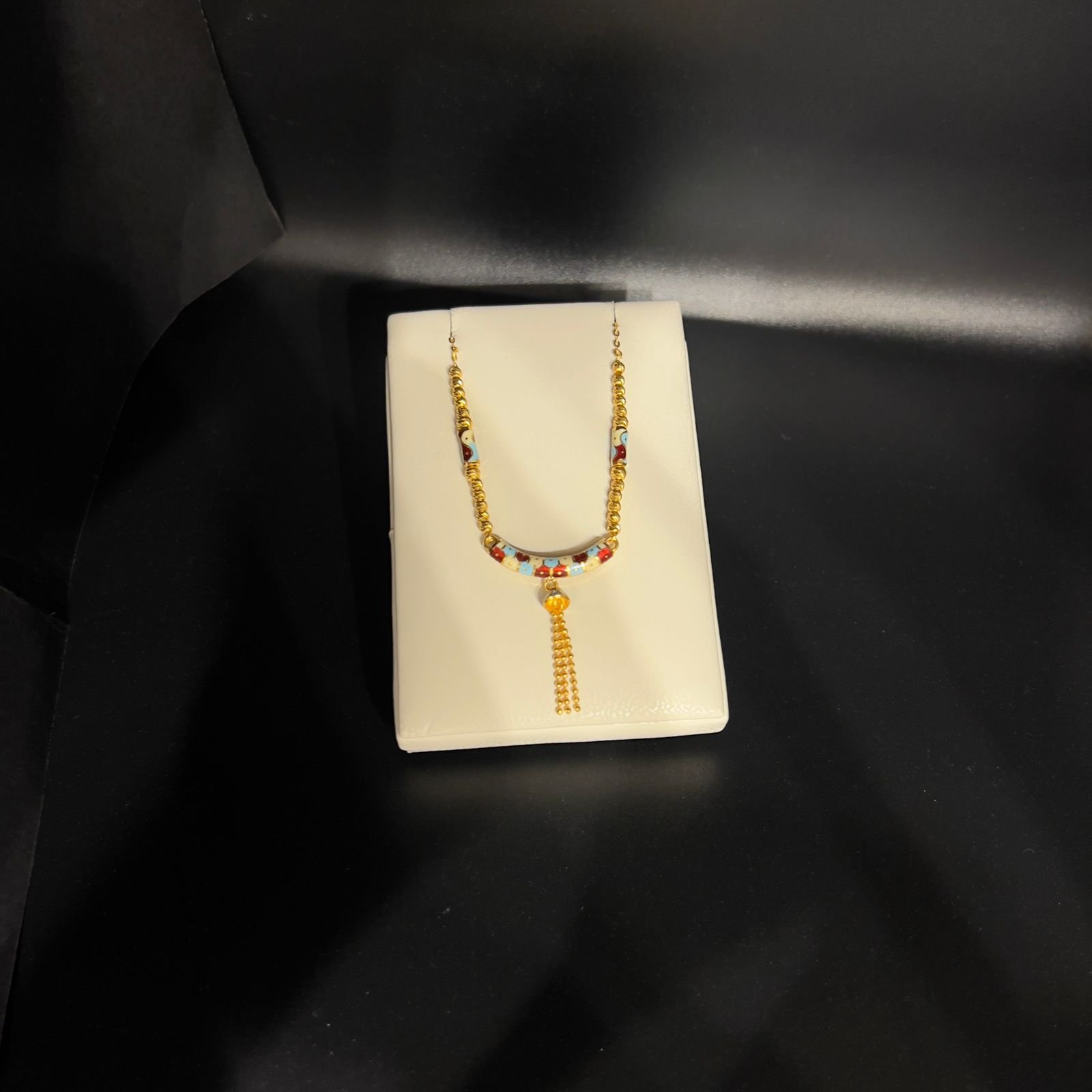 تم تصميم هذا العقد باستخدام عيار 21 من الذهب الخالص لتعزيز متانته وقيمته. بفضل ثقافة التصميم الهندية، يمكنك التمتع بقطعة تتميز بالتفاصيل الدقيقة واللمسات الإبداعية، ما يجعل هذا العقد إضافة مثالية إلى مجموعتك الشخصية.
