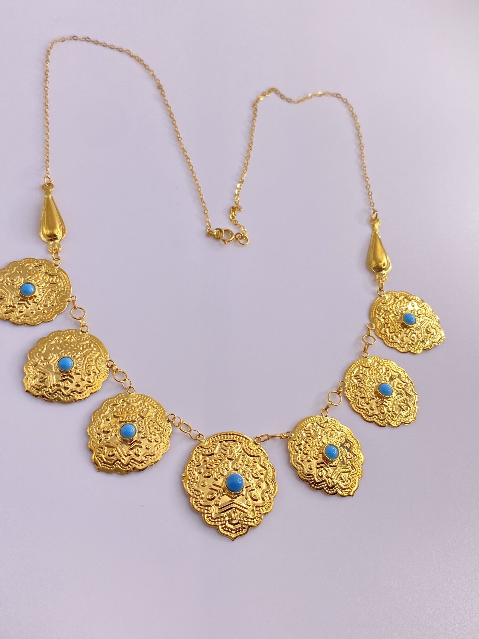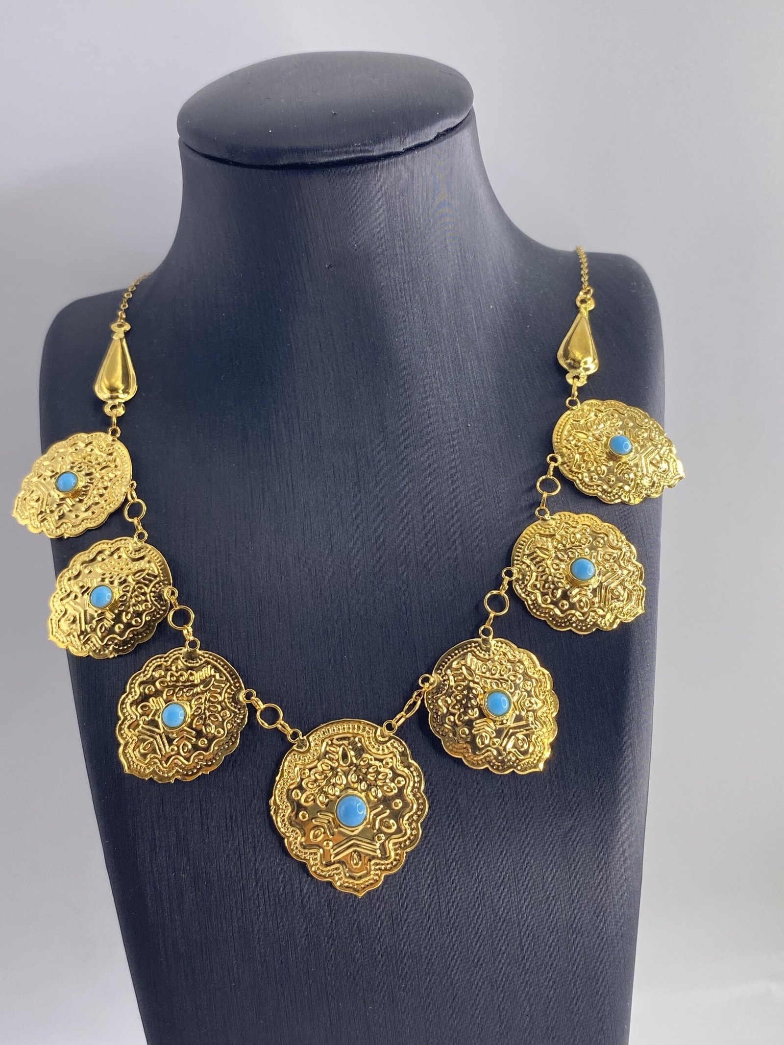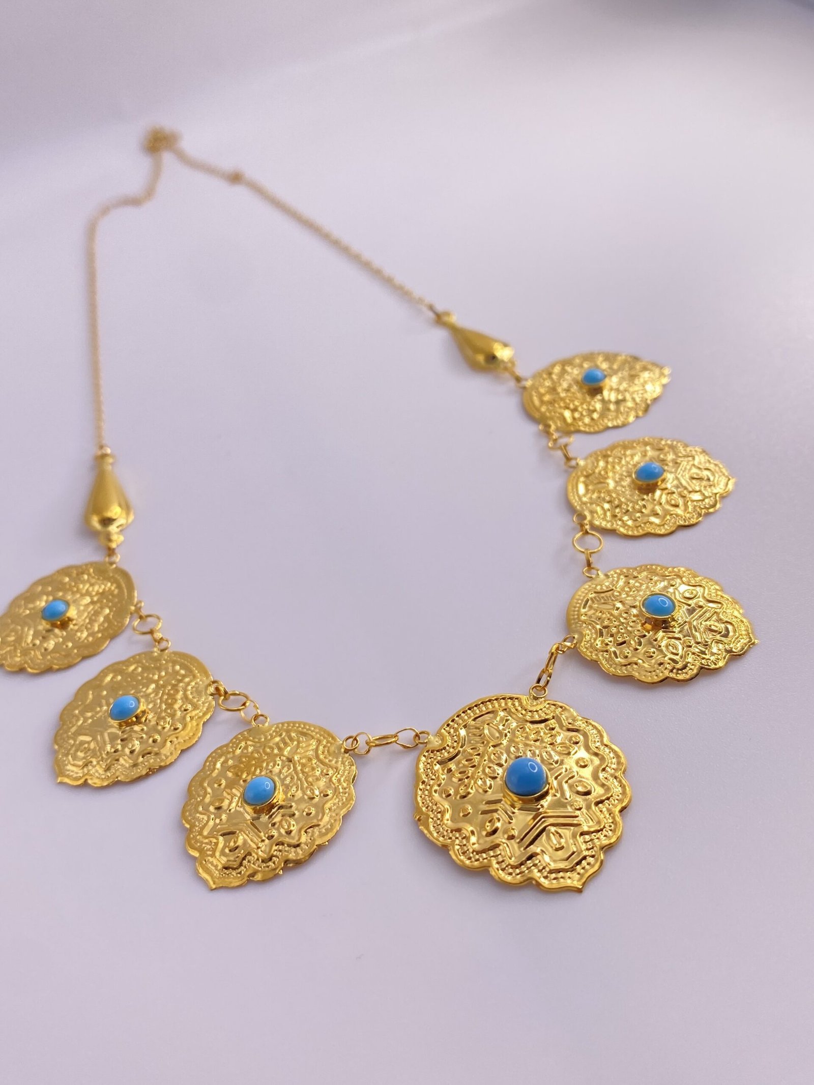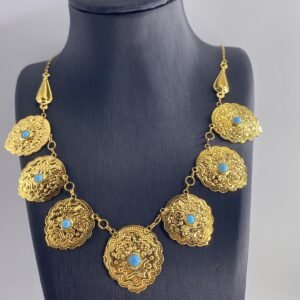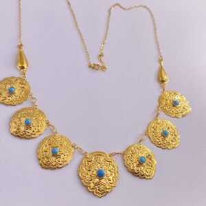 كتجسيد للأصالة والتراث، مخنق القردانة الشعبي يُعرض بتصميم يعكس التاريخ والفن العربي الأصيل. يتميز هذا القلادة بفصوص فيروزية رائعة تضيف لمسة مميزة من الأناقة والجاذبية.